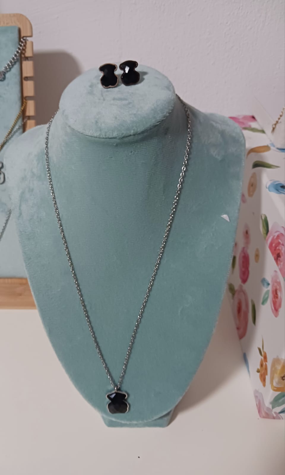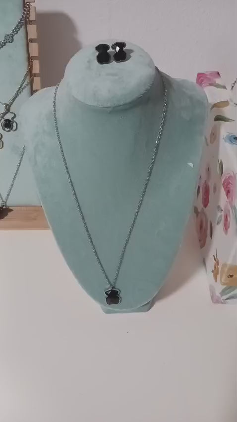 Elegancia, ternura y estilo se unen en este hermoso set de collar y aretes. Fabricado en acero inoxidable de alta calidad, este conjunto presenta un delicado dije en forma de osito con un fondo negro brillante que resalta por su sobriedad y sofisticación.